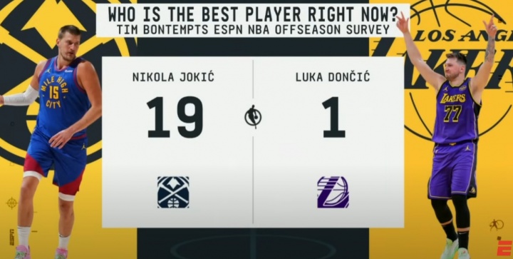 俩欧洲人!ESPN投票选NBA现在最好的球员:约基奇19票 东契奇1票