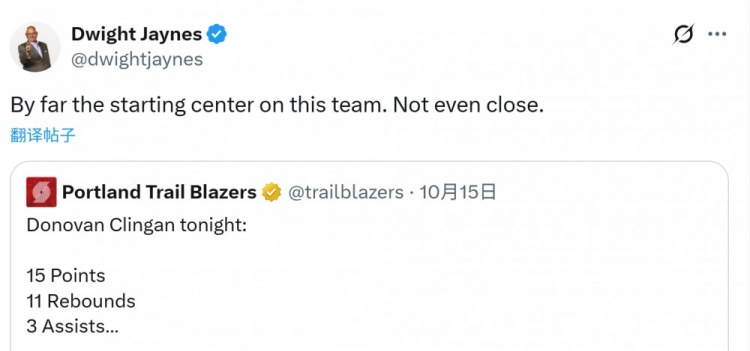赛后开拓者随队记者Dwight Jaynes转发了克林根数据,写道:“绝对是球队的杆位五号位,毫无悬念。”