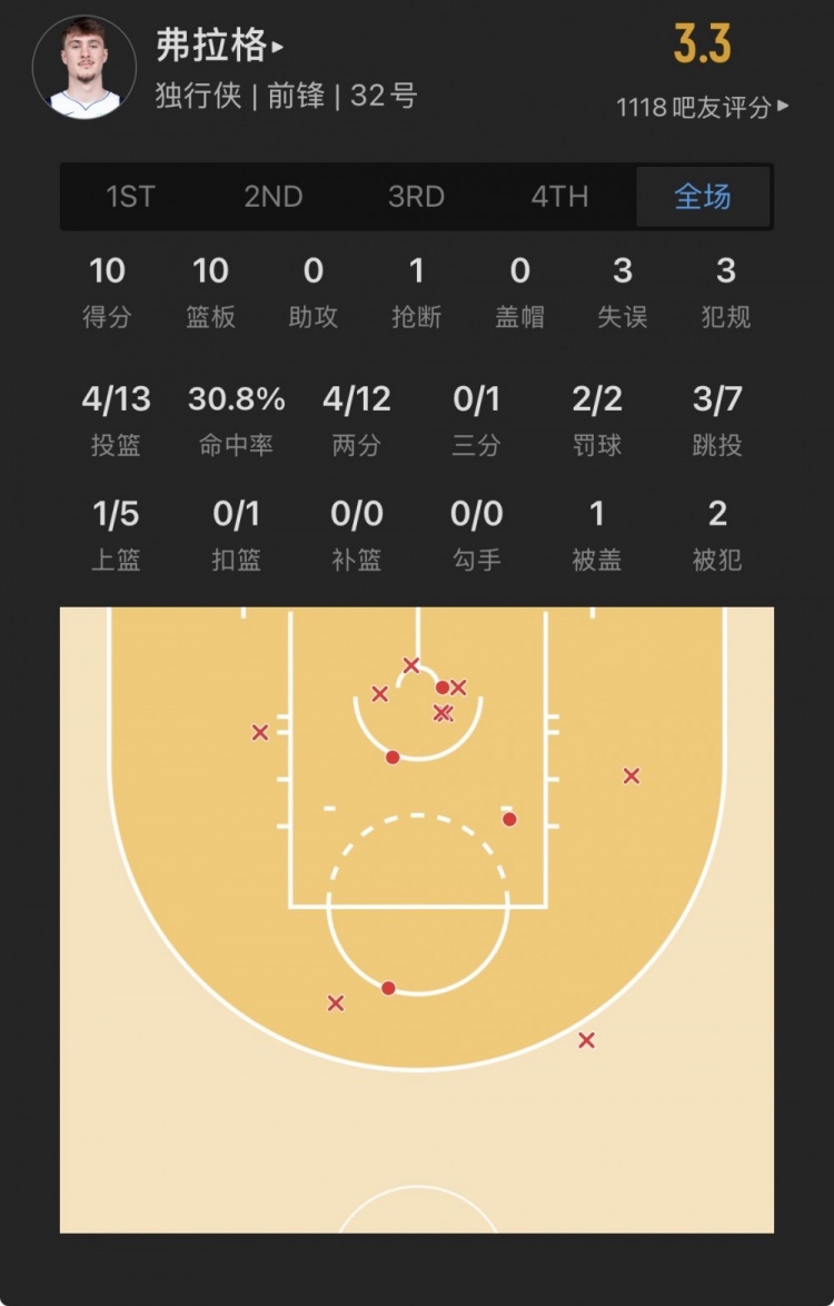 独行侠状元秀 库珀-弗拉格 登场31.5分钟