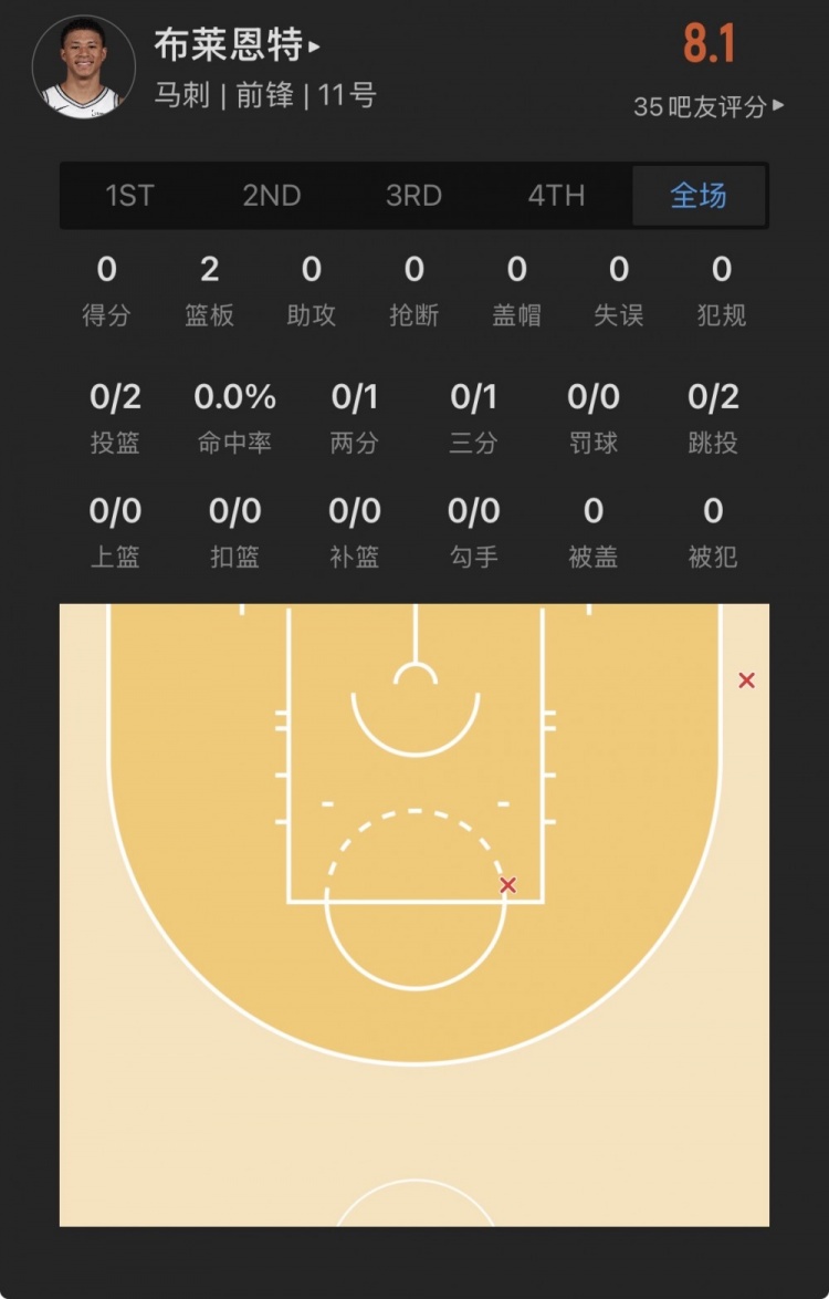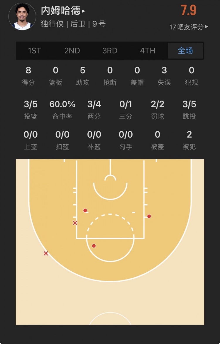 独行侠落球员选拔 瑞安-内姆哈德 登场15.5分钟