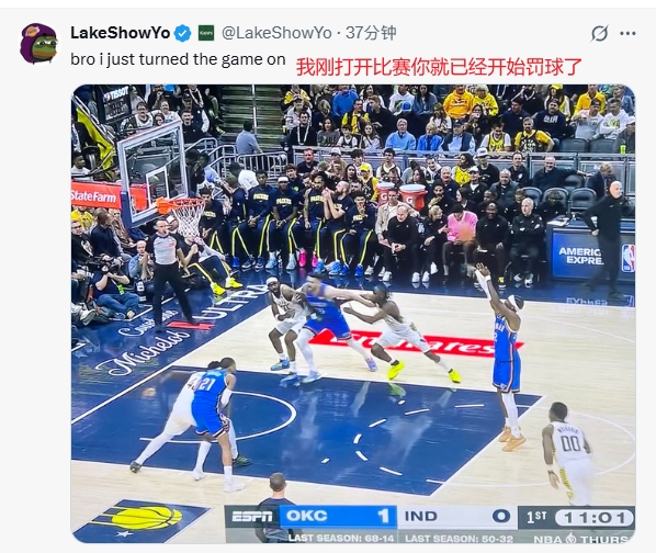 NBA常规赛,雷霆VS步行者正在进行当中。雷霆当家球星亚历山大开场59秒便站上罚球线,cctv5在线直播观看足球亚洲杯首节出战6分钟有7个罚球!美网友在社交媒体上谈到了亚历山大的表现: