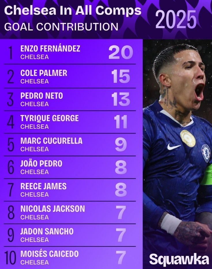 切尔西2025年各项赛事加入 得分 榜:恩佐20球居首,帕尔默次席