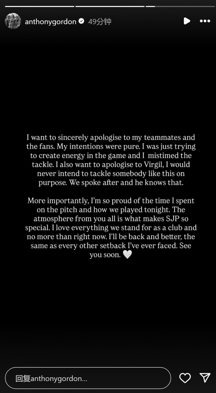 戈登赛后在社交媒体上写道:“我想要真诚地向我的队友和球迷们道歉。我的意图很单纯,我只是想在赛事 中激发一些生气 ,但这次铲球时机把握得不好。我也要向范迪克道歉,我绝不会故意这样铲人。我们之后聊过,他知道这一点。
