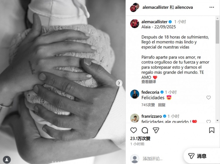 9月24日讯 在社交媒体上,利物浦中场球员麦卡利斯特宣布自己和女友Ailen Cova的孩子降生。