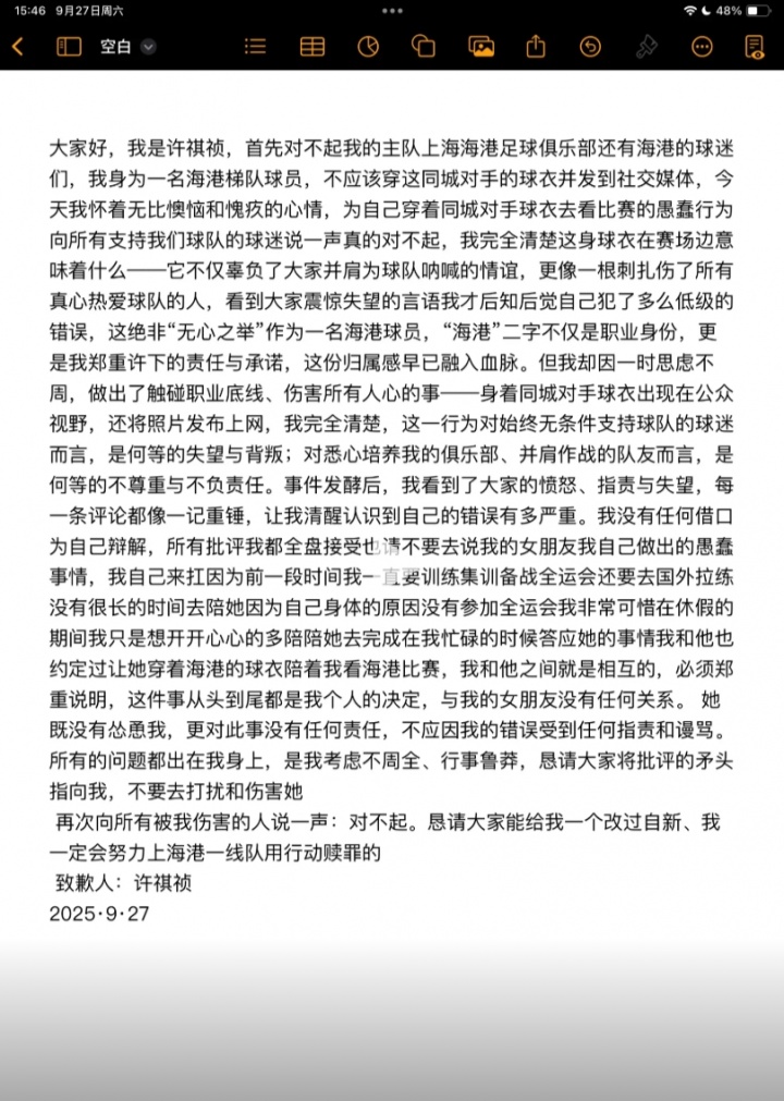 许祺祯致歉信内容如下: