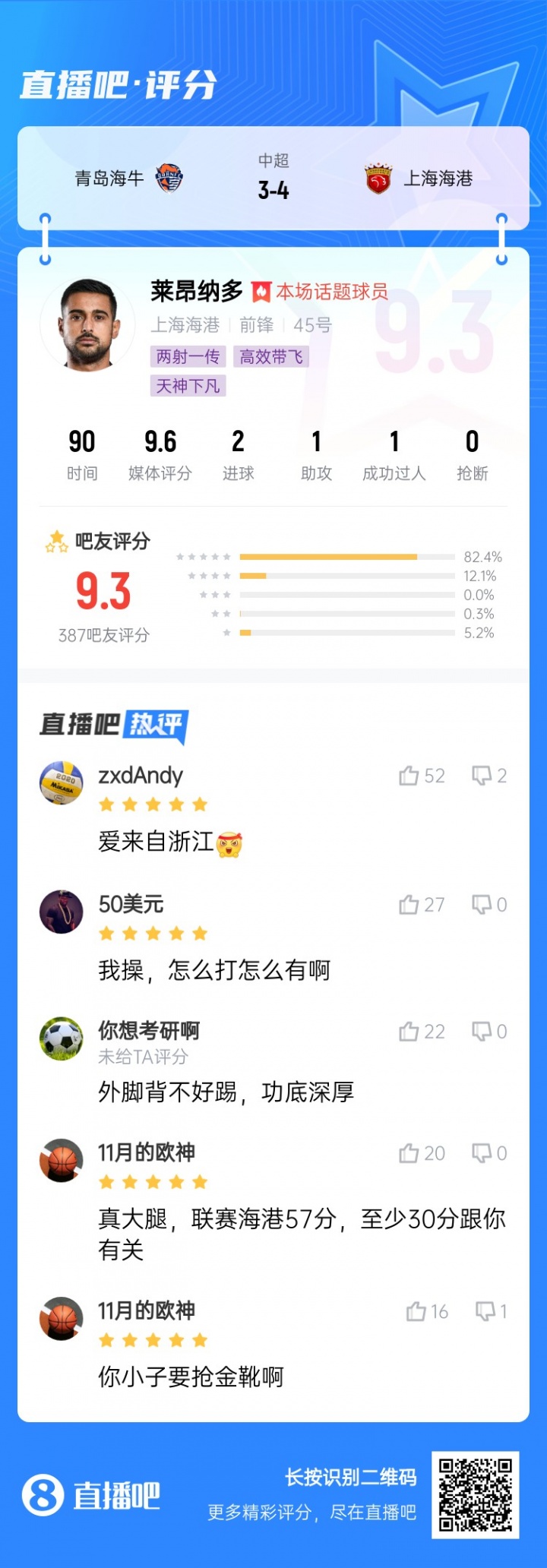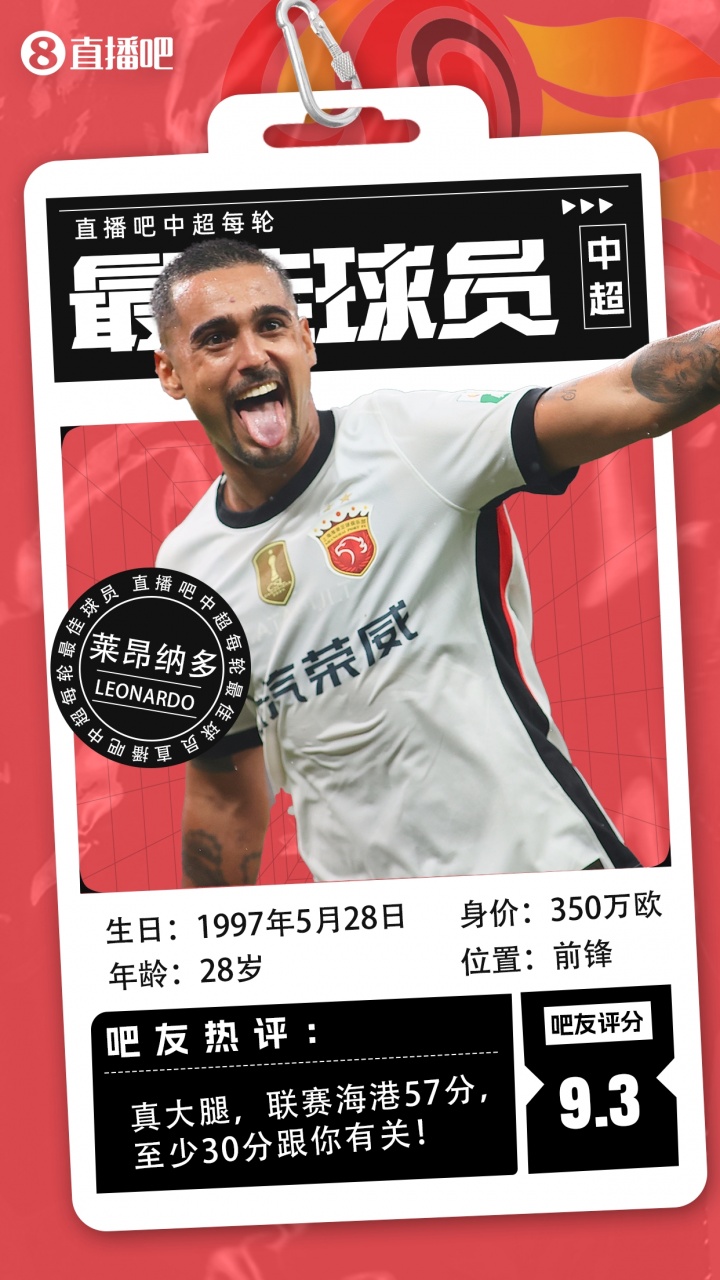 【】中超第27轮最佳球员评选结果出炉,上海海港前场球员莱昂纳多当选!本轮中超莱昂纳多两射一传贡献超神发挥,帮助海港4-3力克青岛海牛。这名28岁的海港真大腿帮助球队捍卫了榜首的荣誉 !