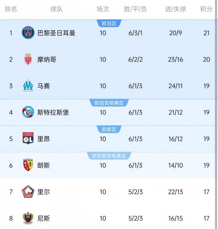 本赛季法甲10轮过后前6名球队仅相差2分,10-11赛季之后同期最少