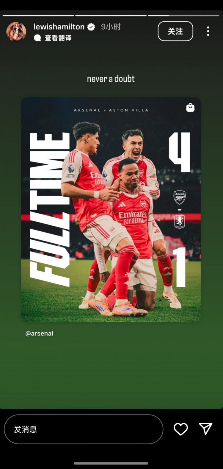 一级方程式司机汉密尔顿INS快拍晒阿森纳本轮赢球海报:从未怀疑过!