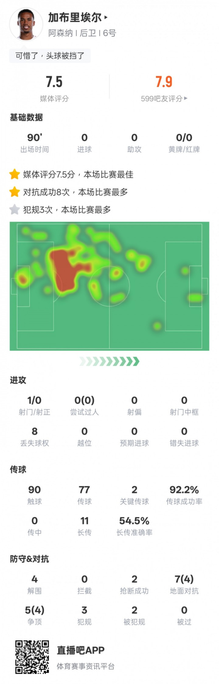 直播吧2月4日讯职业联赛 杯准总决赛 次局 ,阿森纳1-0战胜切尔西,总比分4-2晋级下一轮 总决赛 。本场赛事 ,加布里埃尔杆位出战,打满全场,8次对峙 成功全场最多,还有2次关键传送球 ,传送球 成功率达到92.2%,评分7.5并列全场最高。