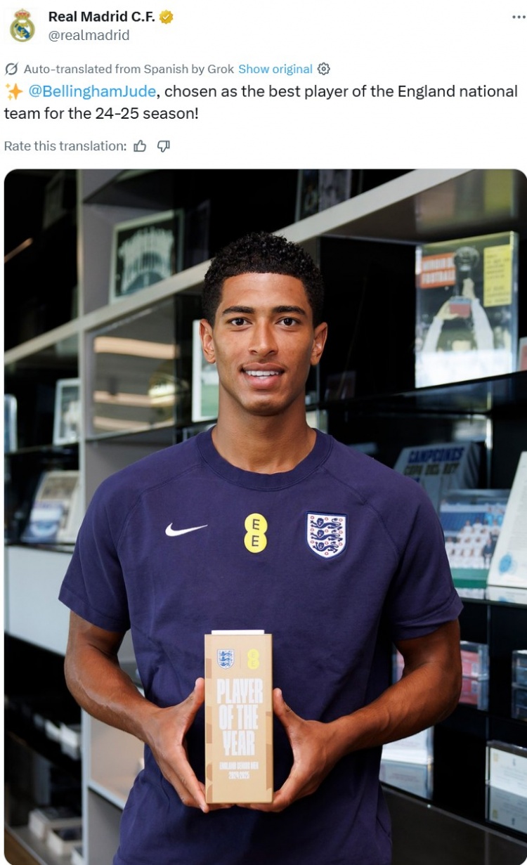 贝林厄姆当选英格兰24/25赛季最佳男古代足球 员,皇马官推送上祝贺