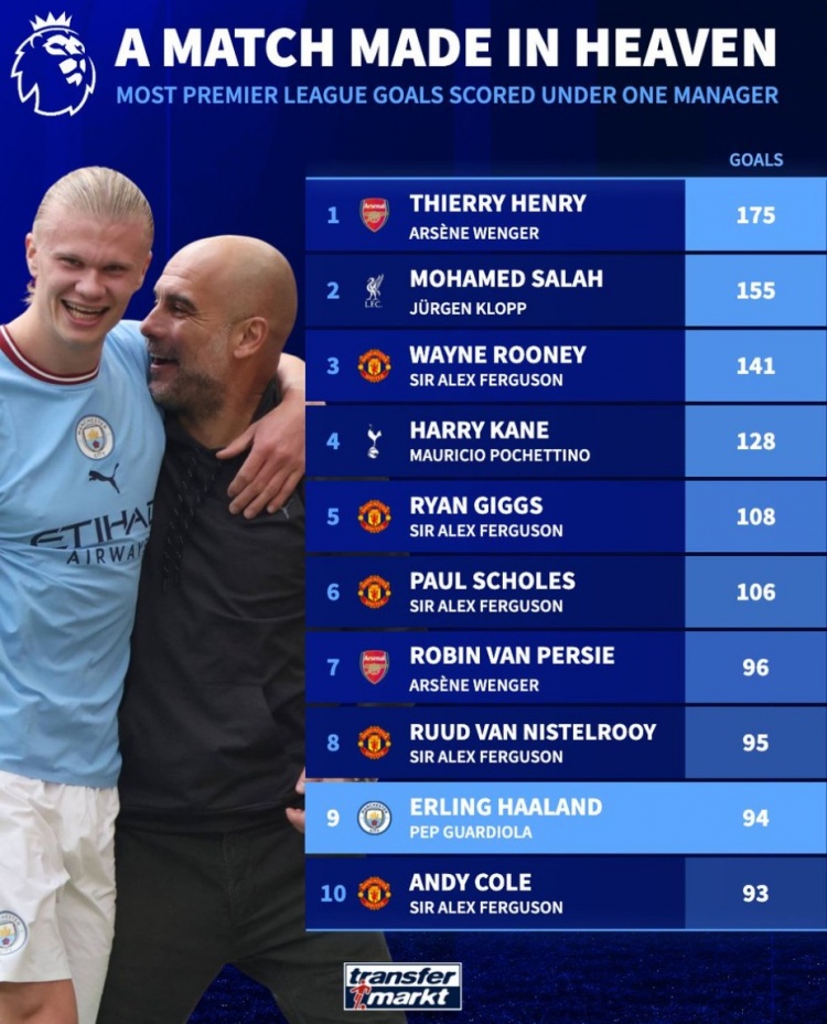 英超同一主帅治下球员得分 榜:亨利175球居首,萨拉赫155球