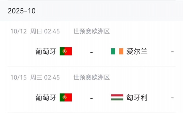 葡萄牙10月份将出战两场世预赛欧洲区赛事 :10月12日主场作战 迎战爱尔兰,10月15日迎战匈牙利。目前葡萄牙在世预赛欧洲区F组中2战全胜排名小组第1。