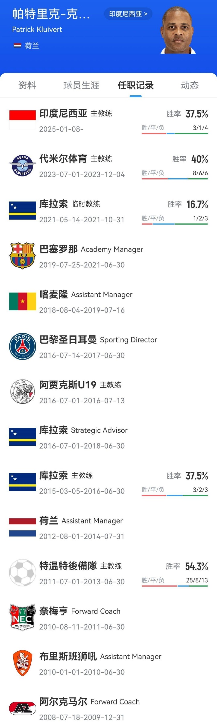 克鲁伊维特现年49岁,球员时代他是足坛最优秀的射手之一,曾效力阿贾克斯、AC米兰、巴萨等队,退役后曾担任喀麦隆助教、库拉索代理主帅。他执教印尼前唯一一段正式主帅经历是2023年7月起担任土超代米尔体育主帅,20场赛事 8胜6平6负,执教5个月便下课。克鲁伊维特还担任过荷兰国家队主帅范加尔的助教,帮助球队在2014年巴西世界杯赛 获得第三名 。