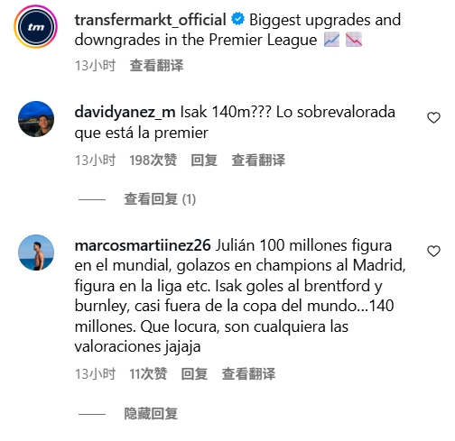 球迷C:“伊萨克身价怎么升到1.4亿的?与此同时竞技状态 回升的福登身价却跌到了8000万欧元。”