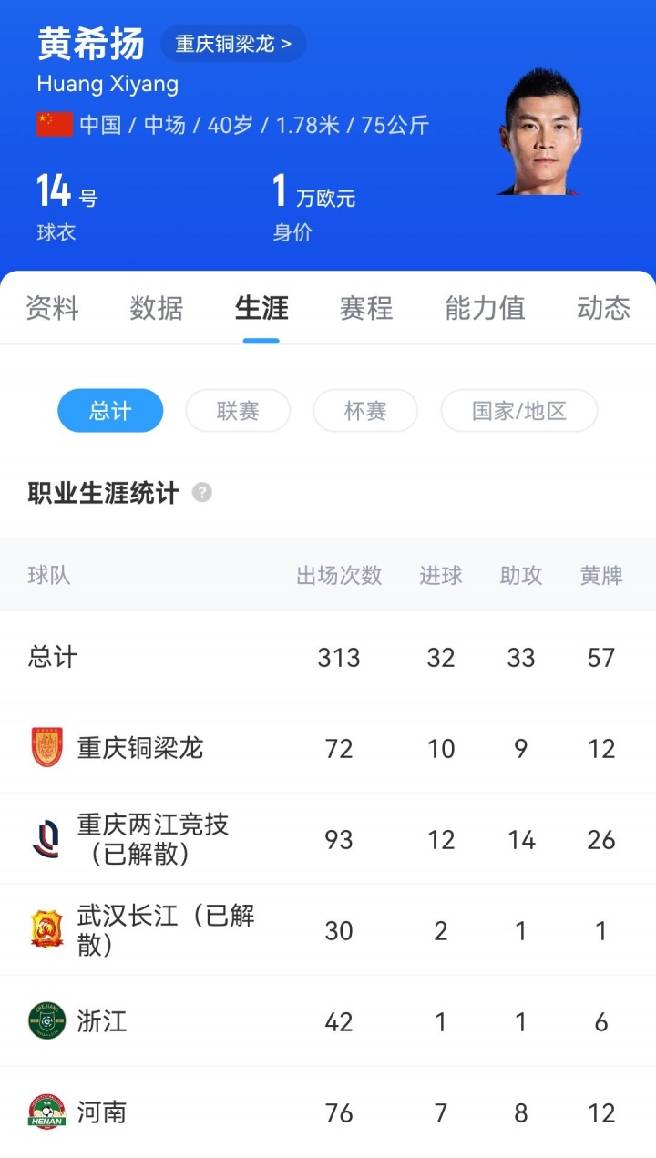 黄希扬是一名地地道道的重庆籍球员,职业生涯也起始于重庆队,之后他也曾辗转河南、杭州绿城、武汉长江,在2020年他又加盟重庆力帆。