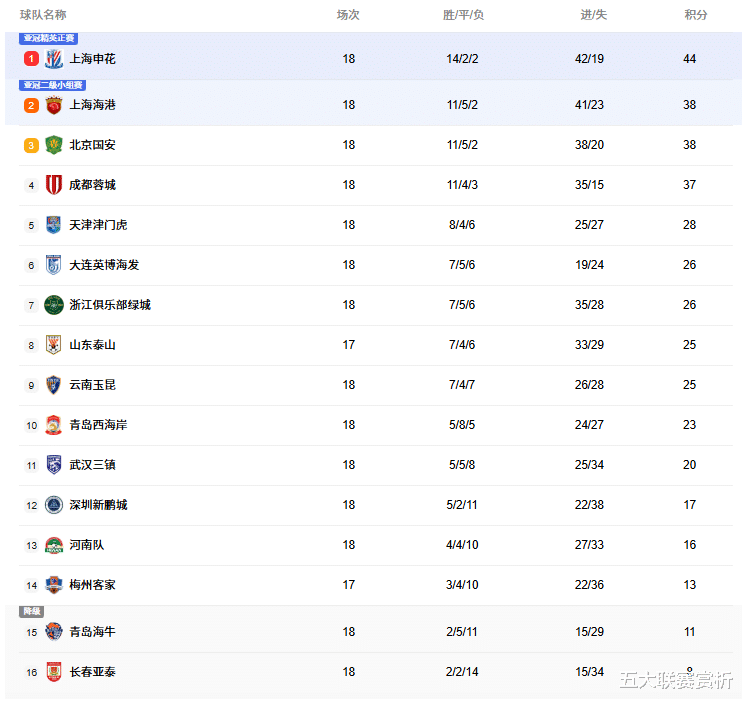 随着申花3-2, 津门虎0-2, 泰山3-0, 中超积分: 争冠+降级热门诞生