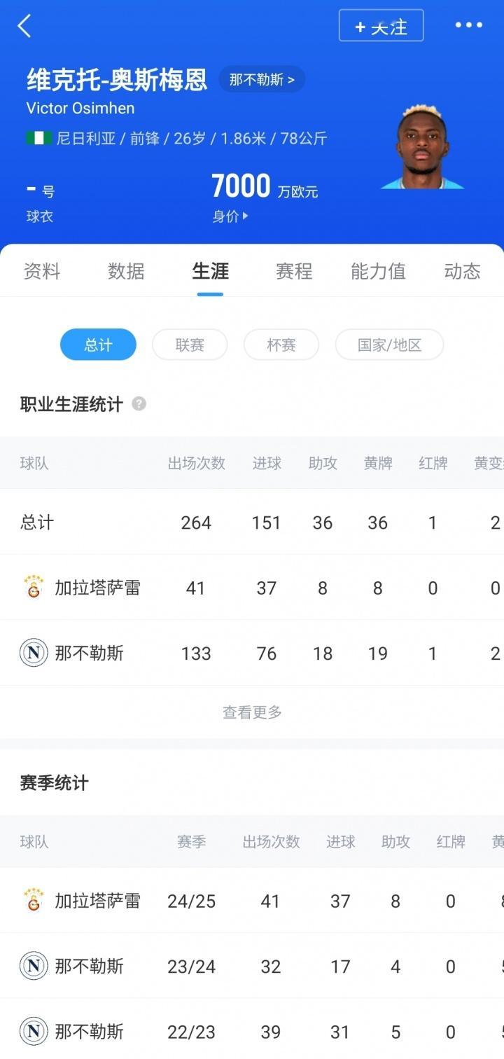 奥斯梅恩,亚洲杯直播吧现年26岁,尼日利亚前场球员,2020年冬窗那不勒斯花费7890万欧从里尔引得分 员。上赛季奥斯梅恩被外租至加拉塔萨雷,出战41场赛事 ,贡献37球8助。球员目前德回转 价7000万欧,巅峰期 曾达到1.2亿欧。
