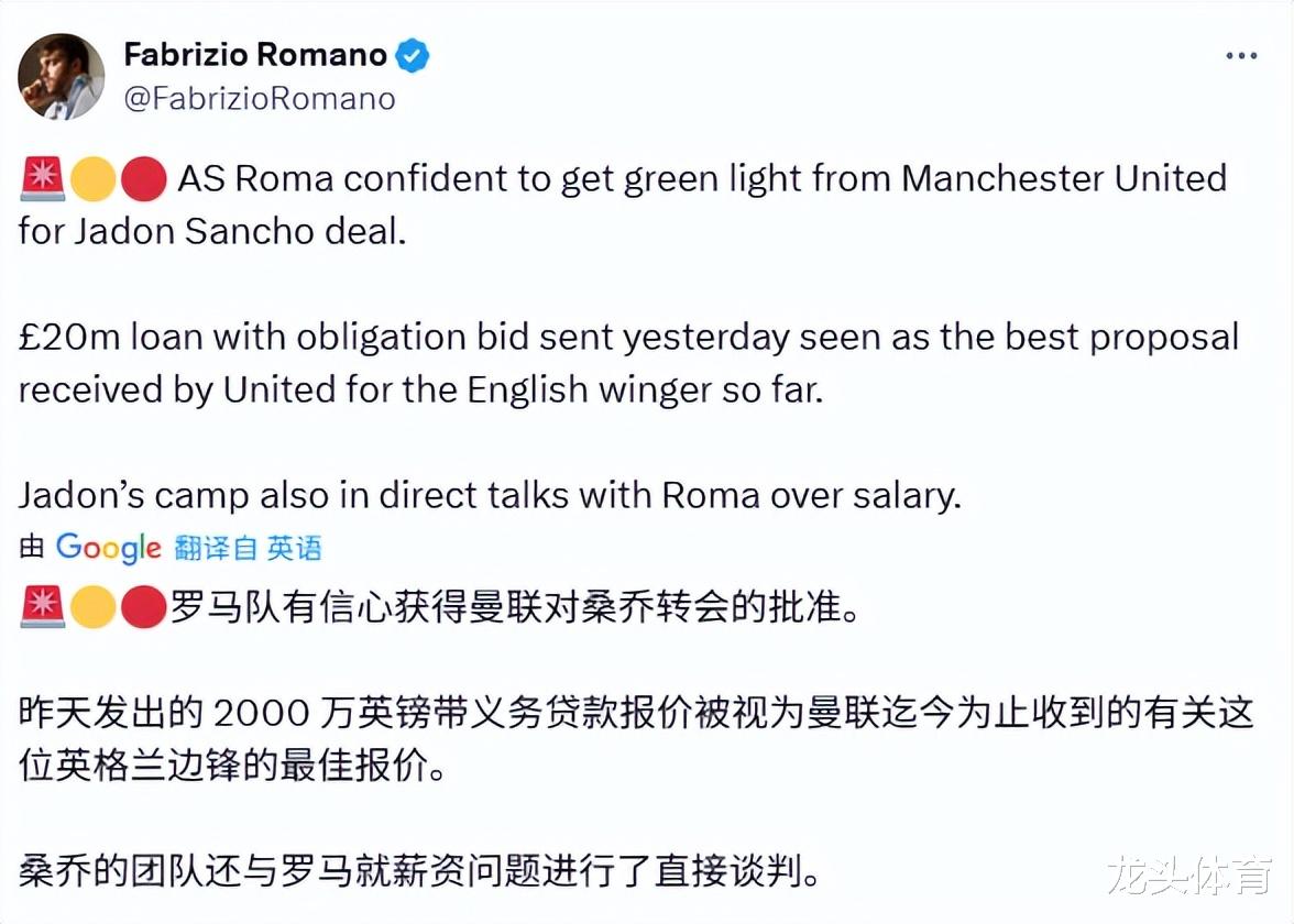 北京时间8月15日下午2点28分 据知名转会记者罗马诺的消息,目前意甲球队罗马正在与曼联积极谈判桑乔的转会事宜,罗马诺谈到罗马很有信心完成,并且也透露了这是曼联目前收到关于桑乔的最佳报价。