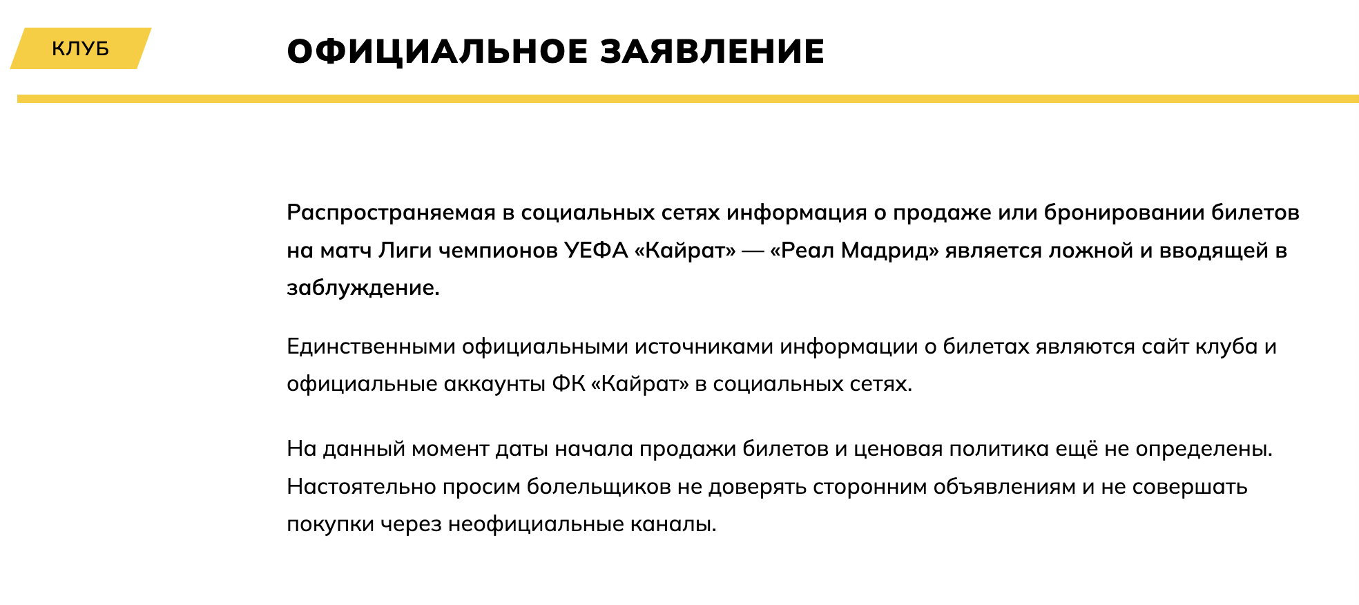 社交媒体上流传的有关欧冠职业联赛 凯拉特vs皇马赛事 门票销售或预定的资讯是虚假和误导性的,有关门票的唯一官方资讯来源,是俱乐部的官网和凯拉特在社交媒体上的官方账户。目前,门票销售开始日期和定价政策尚未确定,我们强烈建议球迷不要轻信第三方,也不要通过非官方渠道购票。
