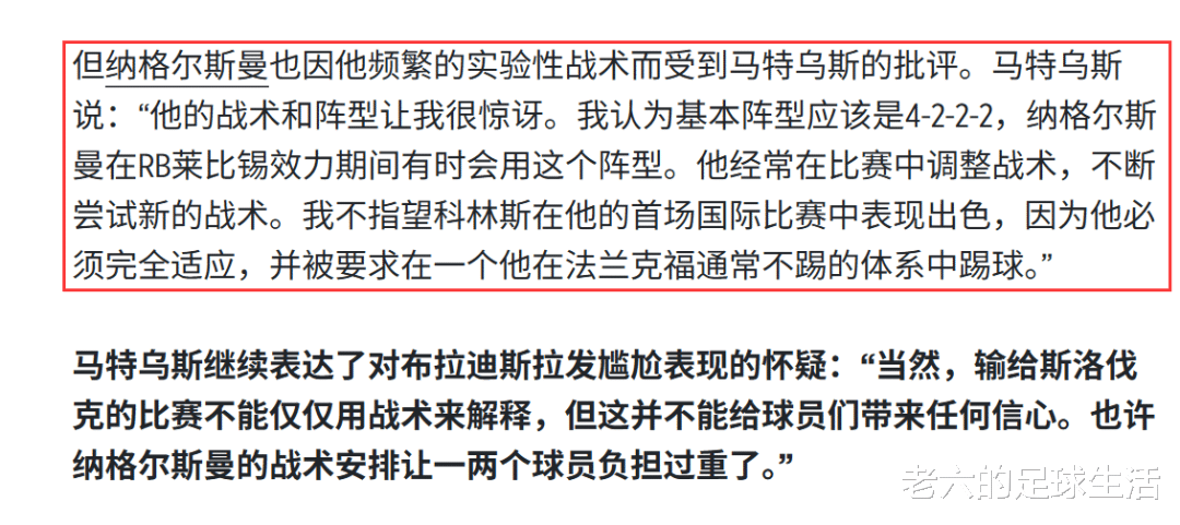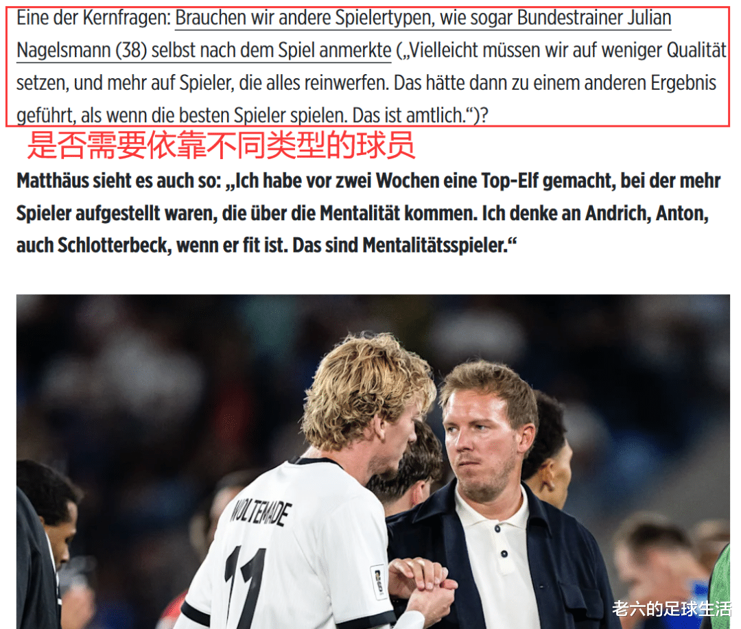 马特乌斯也提到了一个很关键的问题,是否球队需要不同类型的球员,减少对实力球员的依赖,更多的去依靠全力以赴的球员,这也是纳格尔斯曼在赛后ARD麦克风前反思的问题。