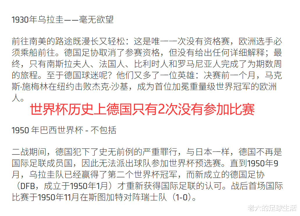 对于德国来说,96年的世界杯赛 历史上只有2次没有参加,一次是1930年在乌拉圭举行的,欧洲球员需要乘船数周去参加赛事 ,德国足协直接取消了参赛。第二次则是二战期间德国不再是国际足联成员国,无法派出球队参加预选赛。