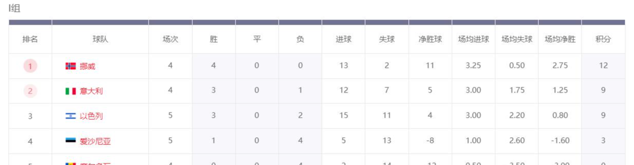 此外,本轮另一支角逐 对手以色列同样积9分,但净胜球为+4,略逊于意大利的+5,因此意大利暂时排名小组第二。