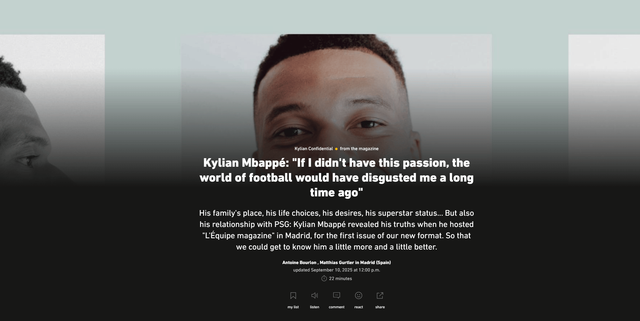 虎扑09月10日讯法国媒体队报独家专访姆巴佩。