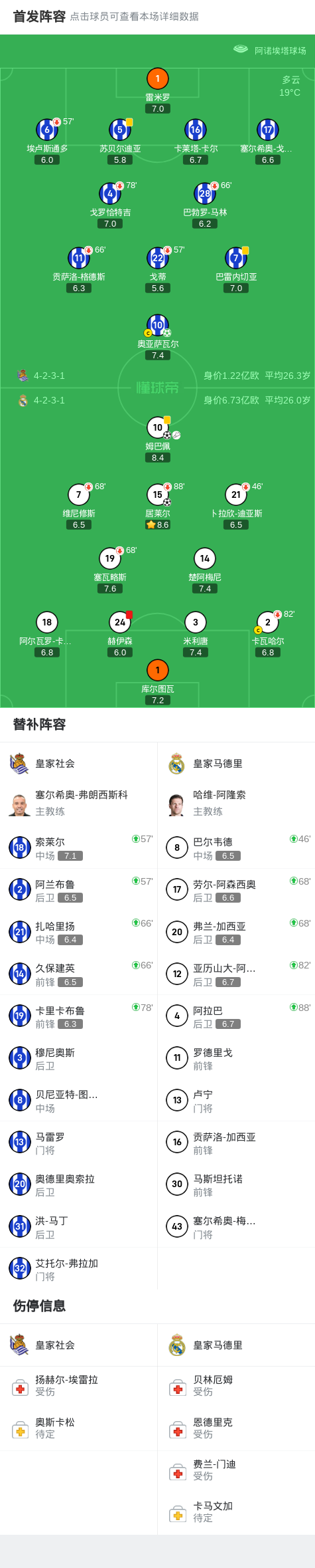 北京时间9月13日晚间22:15,西甲职业联赛 第4轮,皇家马德里做客阿诺埃塔运动活动 场 ,应战 皇家社会。上半场,居莱尔破门被吹,姆巴佩建功,雷米罗屡现神扑,赫伊森染红,姆巴佩助功 居莱尔扩大比分。下半场,楚阿梅尼险些乌龙球,卡瓦哈尔手球运动 送点,奥亚萨瓦尔点射扳回一城,索莱尔失良机。最终实况足球解说是蔡惠强和谁,皇家社会1-2皇家马德里。