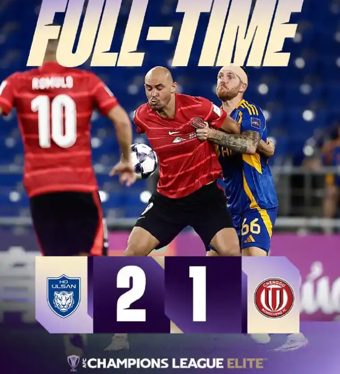 而中超职业联赛 积分榜排名第一的蓉城队即使是客场应战 作战,他们也派出了核心阵形 ,周定洋、罗慕洛、费利佩等主力出战,赛事 第44分钟,德尔加多抽射攻入蓉城队史亚冠正式比赛首球,帮助本队1比0取得领跑 。可惜对手在第76分钟由严元相单刀赴会两连击破门,比分变为1比1。变数发生在下半场补时阶段,先是德尔加多身后违例 ,两黄变一红被罚下,此后,蔚山队在第95分钟破门,蓉城队最终1比2被致胜球 ,输掉了赛事