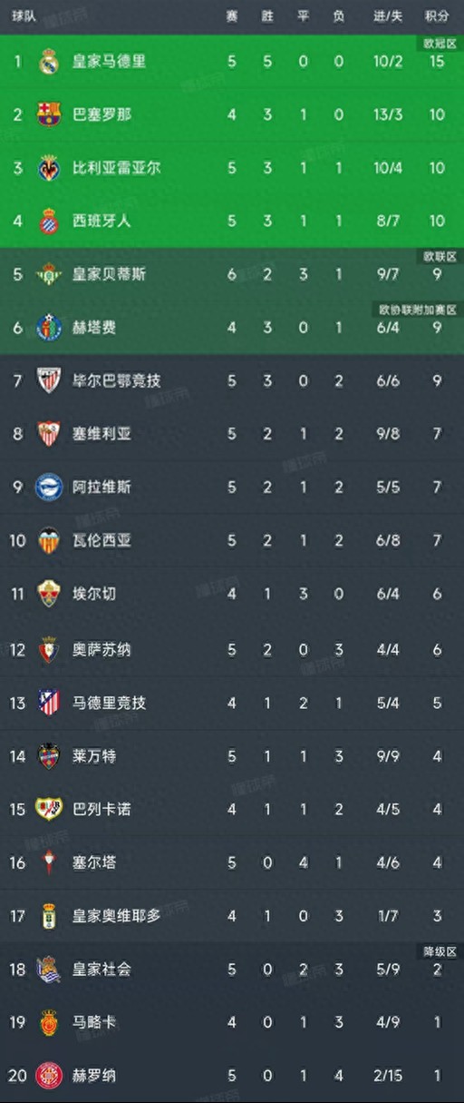 西甲第5轮结束了6场赛事 , 最新积分榜如下!