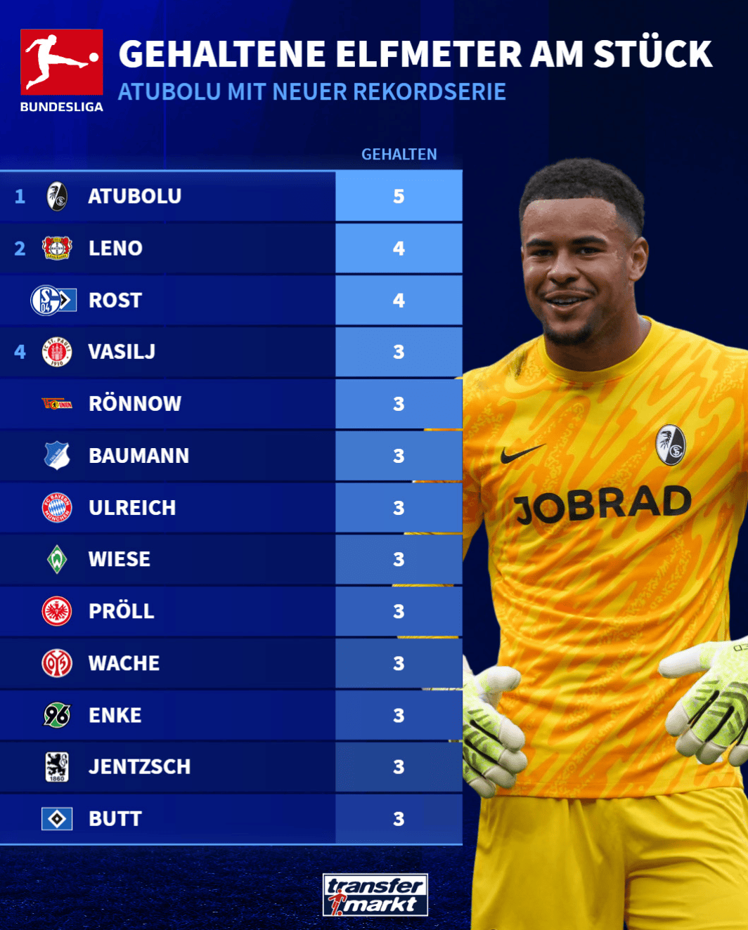 虎扑09月22日讯德转统计了德甲历史上守门员连续完成扑点的榜单。弗赖堡守门员阿图博卢在本轮赛事 中再次扑出十二码球。