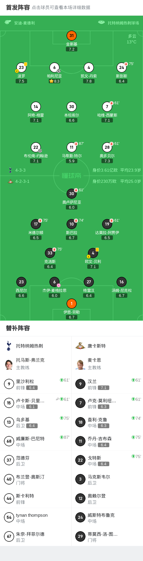 北京时间9月25日2:45,英联杯第三轮,托特纳姆热刺坐镇主场作战 迎战英甲球队唐卡斯特,本场主裁判 为马德利。上半场,帕利尼亚倒钩破门,奥多贝尔造杰伊-麦格拉思乌龙。下半场,贝里瓦尔助功 布伦南-约翰逊单刀赴会破门。最终蔡向阳校园足球,热刺3-0轻取唐卡斯特。
