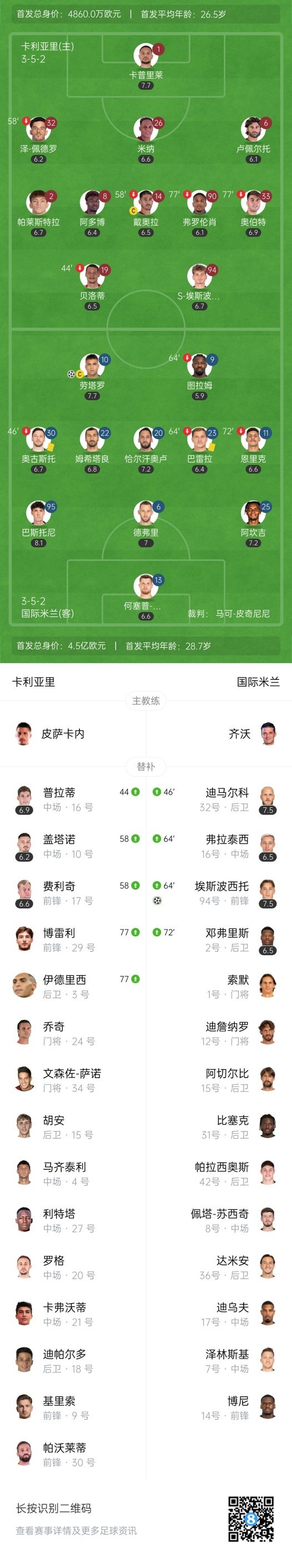 直播吧9月28日讯北京时间9月28日02:45,意甲第5轮国米应战 卡利亚里的赛事 在撒丁岛竞赛 场进行武汉足球蔡晟,上半场巴斯托尼助功 劳塔罗顶球闪击得手,贝洛蒂伤退,下半场恰尔汉奥卢远射中柱,小图拉姆失良机,弗罗伦肖顶球中柱,迪马尔科助功 埃斯波西托推射扩大比分,最终国米2-0卡利亚里取两连胜。