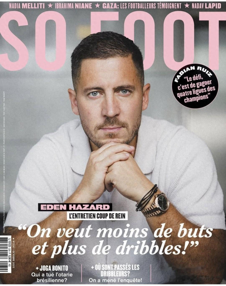 10月2日。有法国非常著名且影响力巨大的古代足球 月更杂志《SO FOOT》推出他们最新一期(2025年10月)作品,封面是已经退役的名宿阿扎尔,内容是提到阿扎尔歌颂梅西的过人。