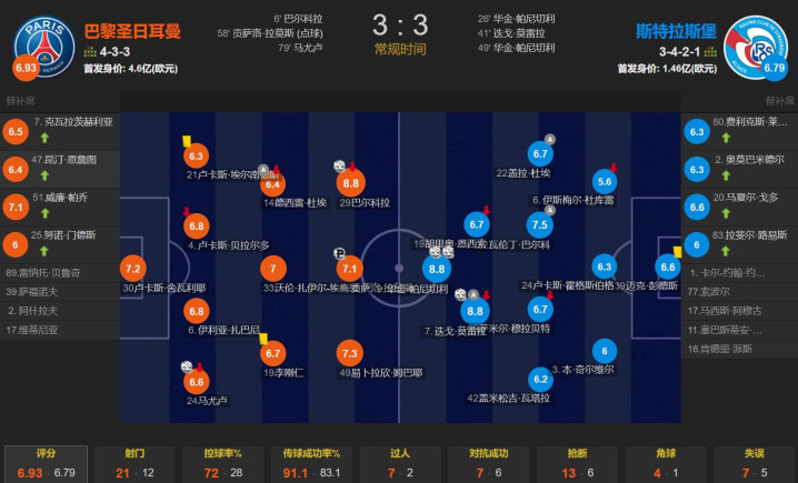 最终,巴黎3-3战平斯特拉斯堡,若本轮法甲马赛和里昂任何一队赢球,巴黎就会失去榜首位置。