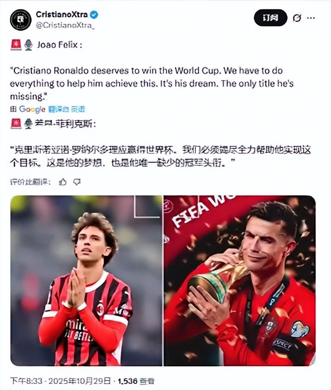 本赛季加入沙特联利雅得获胜 ,跟C罗成为队友的前腰菲利克斯,在社媒上大放厥词道,“看好葡萄牙夺魁 !我们必须竭尽全力帮C罗夺世界杯赛 ,这是他唯一缺少的第一名 !”且不论葡萄牙能夺魁 的概率有多少,这样的大话说出来有多败人品,单就他此言的合时宜性、科学性有多高,恐怕就要打上一个大大的问号。