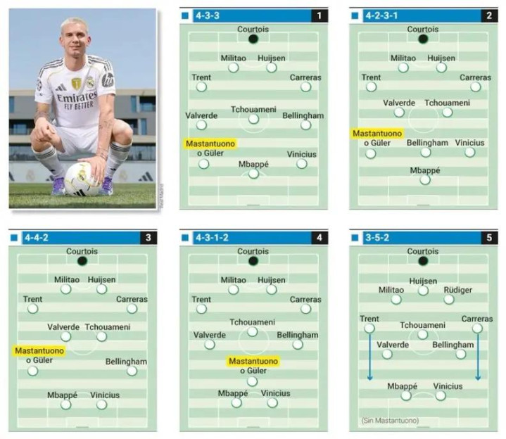 根据西班牙知名媒体阿斯报的消息,哈维-阿隆索还在调试皇马的阵形 ,他将从四名候选球员中确定一名主力右翼锋,马斯坦托诺成为了白衣军团的“阵眼”。